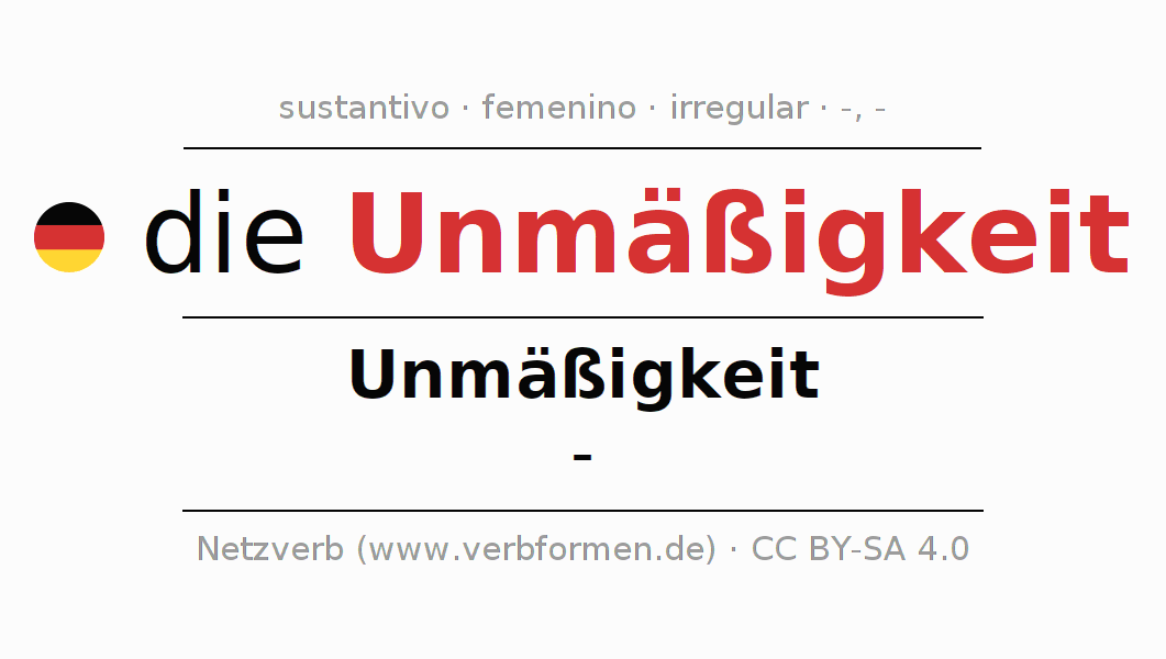 La declinación del sustantivoUnmäßigkeit (desmesura, destemplanza) se encuentra en genitivoUnmäßigkeit del singular y en el nominativo- del plural. El sustantivo Unmäßigkeit se declina con las terminaciones -/-. No permite construcciones en plural. El género gramatical de Unmäßigkeit es femenino y por eso se requiere el artículo definido ‘die’. Aquí puedes declinar no solamente Unmäßigkeit sino también todos los sustantivos alemanes . Comentarios ☆