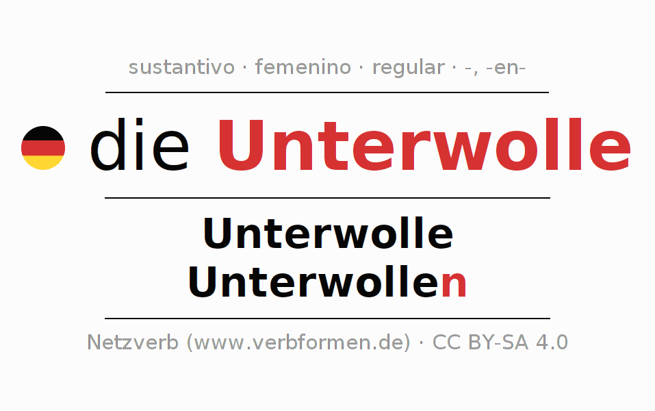 La declinación del sustantivo en forma de tabla con todas su formas: singular, plural y en los cuatro casos: nominativo (primer caso), genitivo (segundo caso), dativo (tercer caso) y acusativo (cuarto caso). Las construcciones gramaticales están representadas de forma clara en una tabla sinópica. La inflexión de los sustantivos es una ayuda durante tareas, exámenes, para cursos de alemán, la universidad, el estudio del alemán como lengua extranjera o como segundo idioma y para estudiantes adultos. La declinación correcta de las palabras es especialmente importante para los que aprenden el idioma alemán. Aquí encontraras más información acerca del tema Wiktionary Unterwolle y aquí también a través del Duden Unterwolle.