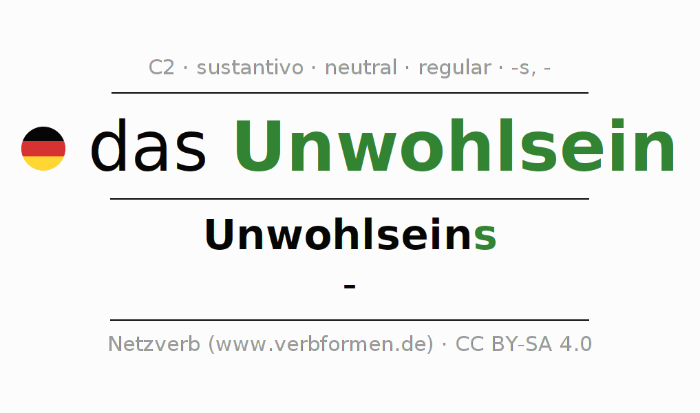 La declinación del sustantivo en forma de tabla con todas su formas: singular, plural y en los cuatro casos: nominativo (primer caso), genitivo (segundo caso), dativo (tercer caso) y acusativo (cuarto caso). Las construcciones gramaticales están representadas de forma clara en una tabla sinópica. La inflexión de los sustantivos es una ayuda durante tareas, exámenes, para cursos de alemán, la universidad, el estudio del alemán como lengua extranjera o como segundo idioma y para estudiantes adultos. La declinación correcta de las palabras es especialmente importante para los que aprenden el idioma alemán. Aquí encontraras más información acerca del tema Wiktionary Unwohlsein y aquí también a través del Duden Unwohlsein.
