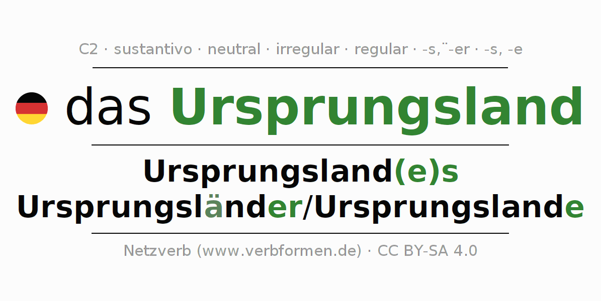 La declinación del sustantivo en forma de tabla con todas su formas: singular, plural y en los cuatro casos: nominativo (primer caso), genitivo (segundo caso), dativo (tercer caso) y acusativo (cuarto caso). Las construcciones gramaticales están representadas de forma clara en una tabla sinópica. La inflexión de los sustantivos es una ayuda durante tareas, exámenes, para cursos de alemán, la universidad, el estudio del alemán como lengua extranjera o como segundo idioma y para estudiantes adultos. La declinación correcta de las palabras es especialmente importante para los que aprenden el idioma alemán. Aquí encontraras más información acerca del tema Wiktionary Ursprungsland y aquí también a través del Duden Ursprungsland.