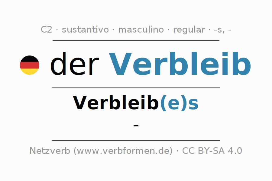 La declinación del sustantivoVerbleib (paradero, permanencia) se encuentra en genitivoVerbleib(e)s del singular y en el nominativo- del plural. El sustantivo Verbleib se conjuga de forma fuerte (irregular) con estas terminaciones es/-. No permite construcciones en plural. El género gramatical de Verbleib es masculino y por eso se requiere el artículo definido ‘der’. Aquí puedes declinar no solamente Verbleib sino también todos los sustantivos alemanes . Este sustantivo pertenece al vocabulario necesario para pasar el examen "Zertifikat Deutsch" o para el nivel C2. Comentarios ☆