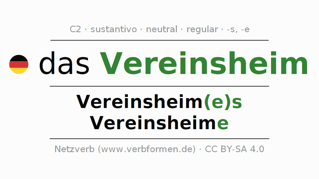 La declinación del sustantivo en forma de tabla con todas su formas: singular, plural y en los cuatro casos: nominativo (primer caso), genitivo (segundo caso), dativo (tercer caso) y acusativo (cuarto caso). Las construcciones gramaticales están representadas de forma clara en una tabla sinópica. La inflexión de los sustantivos es una ayuda durante tareas, exámenes, para cursos de alemán, la universidad, el estudio del alemán como lengua extranjera o como segundo idioma y para estudiantes adultos. La declinación correcta de las palabras es especialmente importante para los que aprenden el idioma alemán. Aquí encontraras más información acerca del tema Wiktionary Vereinsheim y aquí también a través del Duden Vereinsheim.
