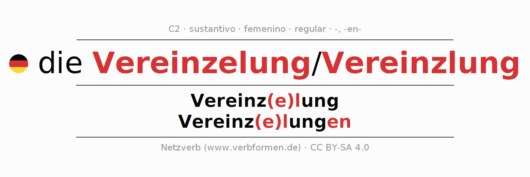 La declinación del sustantivo en forma de tabla con todas su formas: singular, plural y en los cuatro casos: nominativo (primer caso), genitivo (segundo caso), dativo (tercer caso) y acusativo (cuarto caso). Las construcciones gramaticales están representadas de forma clara en una tabla sinópica. La inflexión de los sustantivos es una ayuda durante tareas, exámenes, para cursos de alemán, la universidad, el estudio del alemán como lengua extranjera o como segundo idioma y para estudiantes adultos. La declinación correcta de las palabras es especialmente importante para los que aprenden el idioma alemán. Aquí encontraras más información acerca del tema Wiktionary Vereinzelung y aquí también a través del Duden Vereinzelung.