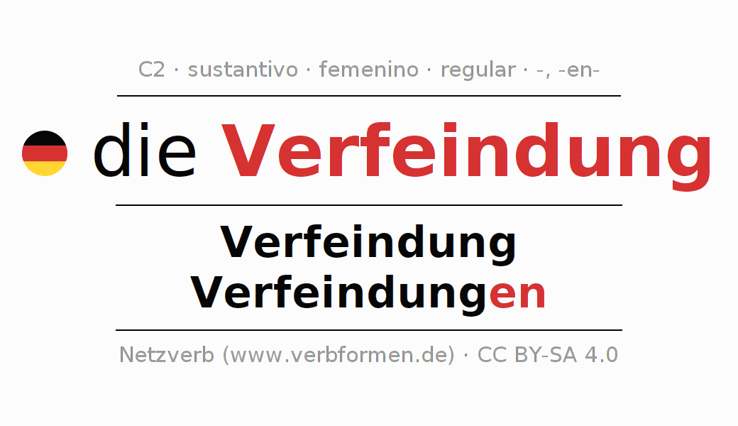 La declinación del sustantivo en forma de tabla con todas su formas: singular, plural y en los cuatro casos: nominativo (primer caso), genitivo (segundo caso), dativo (tercer caso) y acusativo (cuarto caso). Las construcciones gramaticales están representadas de forma clara en una tabla sinópica. La inflexión de los sustantivos es una ayuda durante tareas, exámenes, para cursos de alemán, la universidad, el estudio del alemán como lengua extranjera o como segundo idioma y para estudiantes adultos. La declinación correcta de las palabras es especialmente importante para los que aprenden el idioma alemán. Aquí encontraras más información acerca del tema Wiktionary Verfeindung y aquí también a través del Duden Verfeindung.