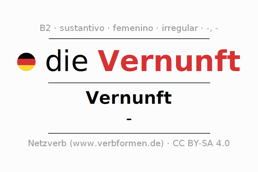 La declinación del sustantivoVernunft (razón, juicio) se encuentra en genitivoVernunft del singular y en el nominativo- del plural. El sustantivo Vernunft se declina con las terminaciones -/-. No permite construcciones en plural. El género gramatical de Vernunft es femenino y por eso se requiere el artículo definido ‘die’. Aquí puedes declinar no solamente Vernunft sino también todos los sustantivos alemanes . Este sustantivo pertenece al vocabulario necesario para pasar el examen "Zertifikat Deutsch" o para el nivel B2. Comentarios ☆