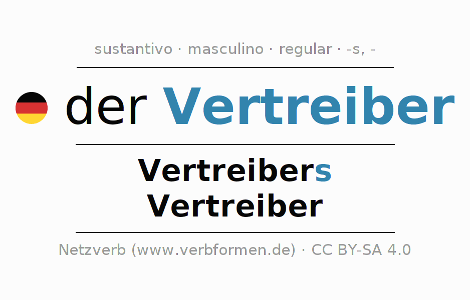 La declinación del sustantivoVertreiber (distribuidor, vendedor) se encuentra en genitivoVertreibers del singular y en el nominativoVertreiber del plural. El sustantivo Vertreiber se conjuga de forma fuerte (irregular) con estas terminaciones s/-. El género gramatical de Vertreiber es masculino y por eso se requiere el artículo definido ‘der’. Aquí puedes declinar no solamente Vertreiber sino también todos los sustantivos alemanes . Comentarios ☆