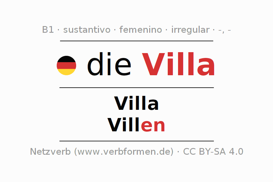 La declinación del sustantivoVilla (mansión, casoplón) se encuentra en genitivoVilla del singular y en el nominativoVillen del plural. El sustantivo Villa se declina con las terminaciones -/en. El género gramatical de Villa es femenino y por eso se requiere el artículo definido ‘die’. Aquí puedes declinar no solamente Villa sino también todos los sustantivos alemanes . Este sustantivo pertenece al vocabulario necesario para pasar el examen "Zertifikat Deutsch" o para el nivel B1. Comentarios ☆