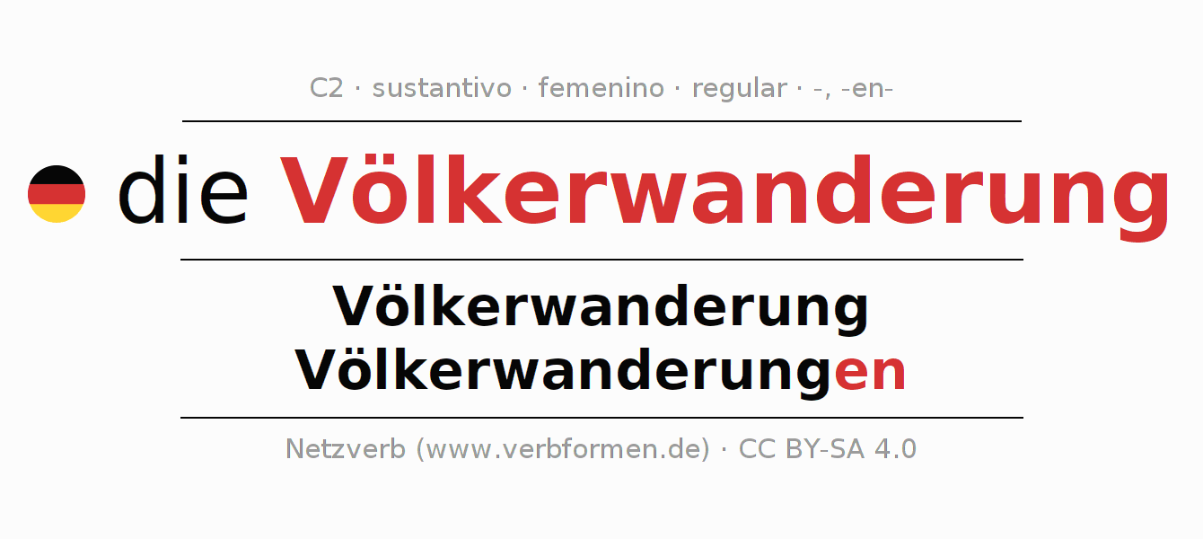 La declinación del sustantivo en forma de tabla con todas su formas: singular, plural y en los cuatro casos: nominativo (primer caso), genitivo (segundo caso), dativo (tercer caso) y acusativo (cuarto caso). Las construcciones gramaticales están representadas de forma clara en una tabla sinópica. La inflexión de los sustantivos es una ayuda durante tareas, exámenes, para cursos de alemán, la universidad, el estudio del alemán como lengua extranjera o como segundo idioma y para estudiantes adultos. La declinación correcta de las palabras es especialmente importante para los que aprenden el idioma alemán. Aquí encontraras más información acerca del tema Wiktionary Völkerwanderung y aquí también a través del Duden Völkerwanderung.