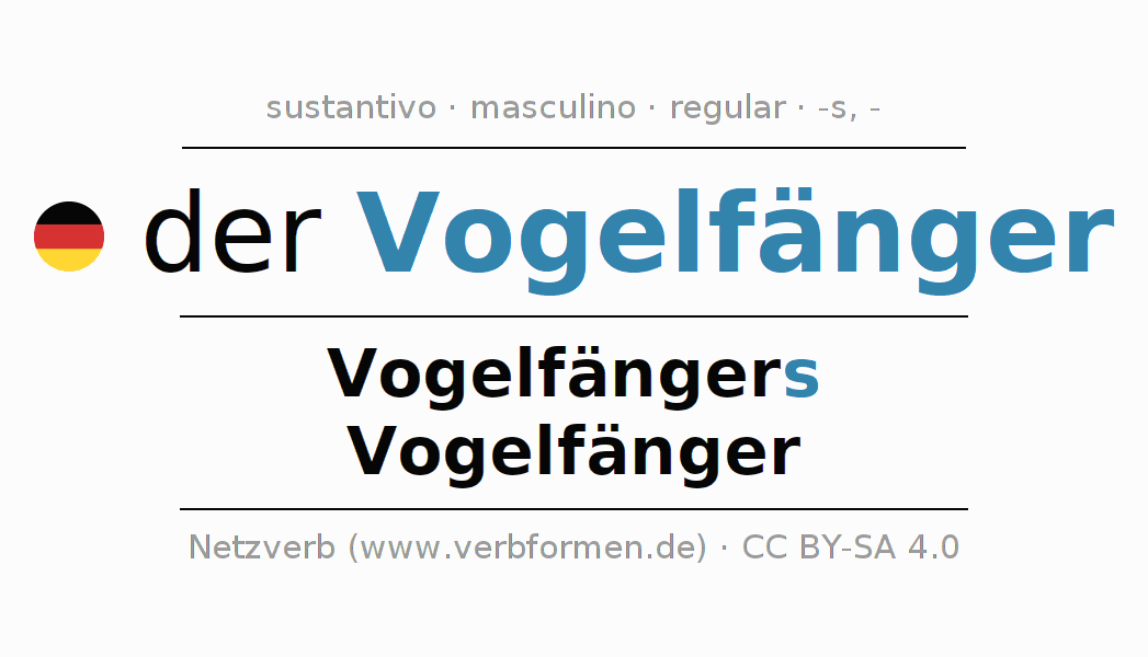 La declinación del sustantivo en forma de tabla con todas su formas: singular, plural y en los cuatro casos: nominativo (primer caso), genitivo (segundo caso), dativo (tercer caso) y acusativo (cuarto caso). Las construcciones gramaticales están representadas de forma clara en una tabla sinópica. La inflexión de los sustantivos es una ayuda durante tareas, exámenes, para cursos de alemán, la universidad, el estudio del alemán como lengua extranjera o como segundo idioma y para estudiantes adultos. La declinación correcta de las palabras es especialmente importante para los que aprenden el idioma alemán. Aquí encontraras más información acerca del tema Wiktionary Vogelfänger y aquí también a través del Duden Vogelfänger.