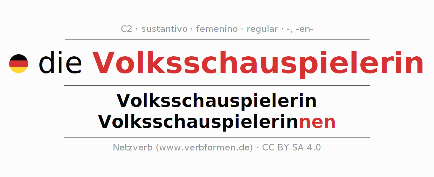La declinación del sustantivo en forma de tabla con todas su formas: singular, plural y en los cuatro casos: nominativo (primer caso), genitivo (segundo caso), dativo (tercer caso) y acusativo (cuarto caso). Las construcciones gramaticales están representadas de forma clara en una tabla sinópica. La inflexión de los sustantivos es una ayuda durante tareas, exámenes, para cursos de alemán, la universidad, el estudio del alemán como lengua extranjera o como segundo idioma y para estudiantes adultos. La declinación correcta de las palabras es especialmente importante para los que aprenden el idioma alemán. Aquí encontraras más información acerca del tema Wiktionary Volksschauspielerin y aquí también a través del Duden Volksschauspielerin.
