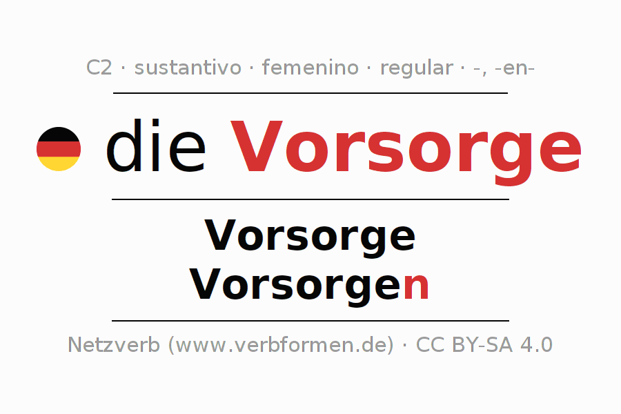 La declinación del sustantivo en forma de tabla con todas su formas: singular, plural y en los cuatro casos: nominativo (primer caso), genitivo (segundo caso), dativo (tercer caso) y acusativo (cuarto caso). Las construcciones gramaticales están representadas de forma clara en una tabla sinópica. La inflexión de los sustantivos es una ayuda durante tareas, exámenes, para cursos de alemán, la universidad, el estudio del alemán como lengua extranjera o como segundo idioma y para estudiantes adultos. La declinación correcta de las palabras es especialmente importante para los que aprenden el idioma alemán. Aquí encontraras más información acerca del tema Wiktionary Vorsorge y aquí también a través del Duden Vorsorge.