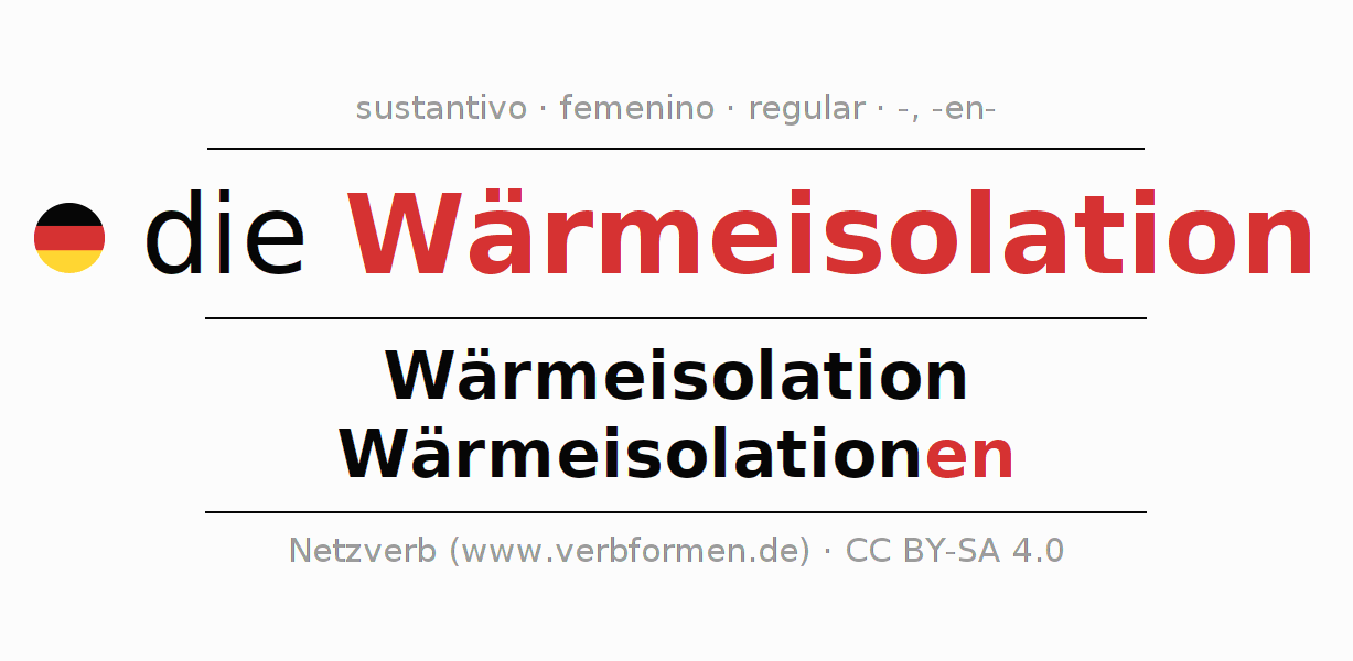 La declinación del sustantivoWärmeisolation (aislamiento térmico, aislante térmico) se encuentra en genitivoWärmeisolation del singular y en el nominativoWärmeisolationen del plural. El sustantivo Wärmeisolation se declina de forma débil con las terminaciones -/en. El género gramatical de Wärmeisolation es femenino y por eso se requiere el artículo definido ‘die’. Aquí puedes declinar no solamente Wärmeisolation sino también todos los sustantivos alemanes . Comentarios ☆