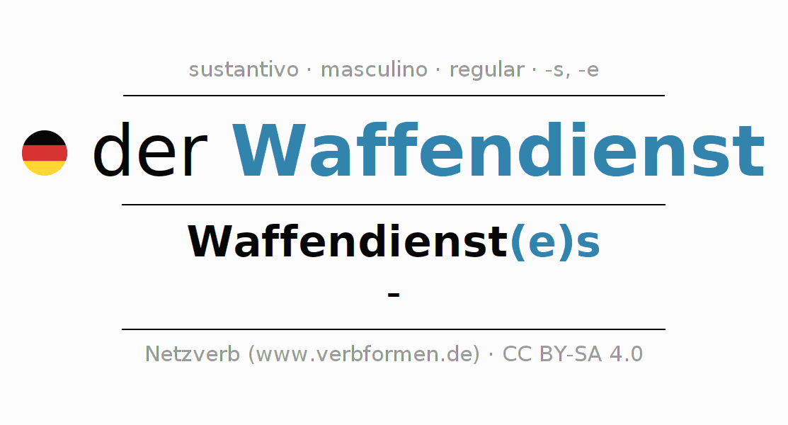 La declinación del sustantivoWaffendienst se encuentra en genitivoWaffendienst(e)s del singular y en el nominativo- del plural. El sustantivo Waffendienst se conjuga de forma fuerte (irregular) con estas terminaciones es/-. No permite construcciones en plural. El género gramatical de Waffendienst es masculino y por eso se requiere el artículo definido ‘der’. Aquí puedes declinar no solamente Waffendienst sino también todos los sustantivos alemanes . Comentarios ☆