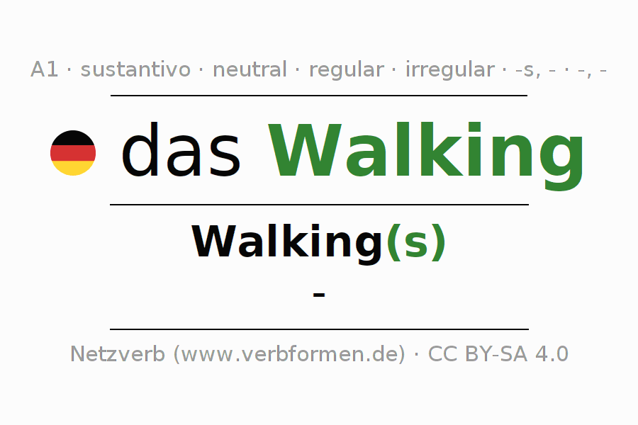 La declinación del sustantivoWalking (andar, caminata) se encuentra en genitivoWalking(s) del singular y en el nominativo- del plural. El sustantivo Walking se conjuga de forma fuerte (irregular) con estas terminaciones s/-/-. No permite construcciones en plural. El género gramatical de Walking es neutro y por eso se requiere el artículo definido ‘das’. Aquí puedes declinar no solamente Walking sino también todos los sustantivos alemanes . Este sustantivo pertenece al vocabulario necesario para pasar el examen "Zertifikat Deutsch" o para el nivel A1. Comentarios ☆