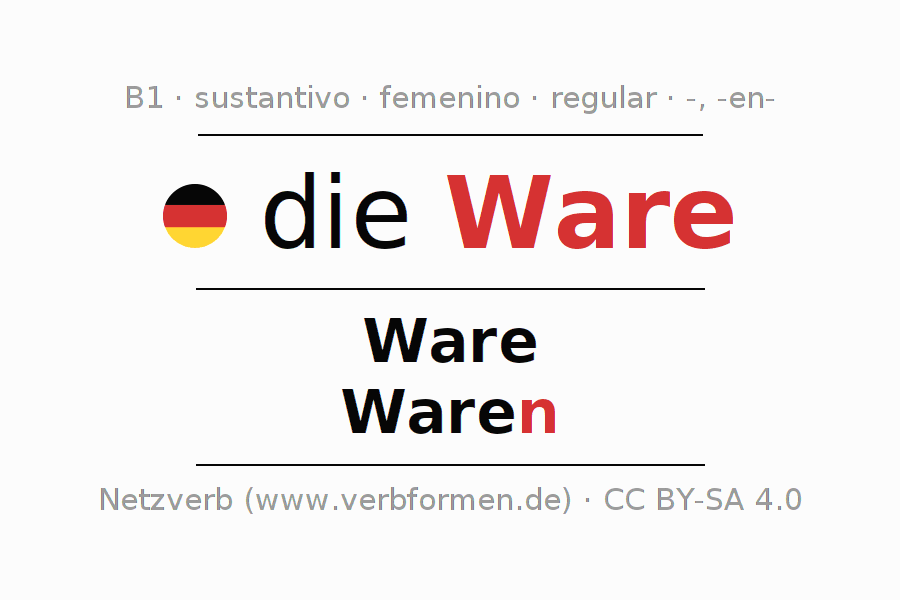 La declinación del sustantivoWare (mercancía, mercadería) se encuentra en genitivoWare del singular y en el nominativoWaren del plural. El sustantivo Ware se declina de forma débil con las terminaciones -/n. El género gramatical de Ware es femenino y por eso se requiere el artículo definido ‘die’. Aquí puedes declinar no solamente Ware sino también todos los sustantivos alemanes . Este sustantivo pertenece al vocabulario necesario para pasar el examen "Zertifikat Deutsch" o para el nivel B1. Comentarios ☆