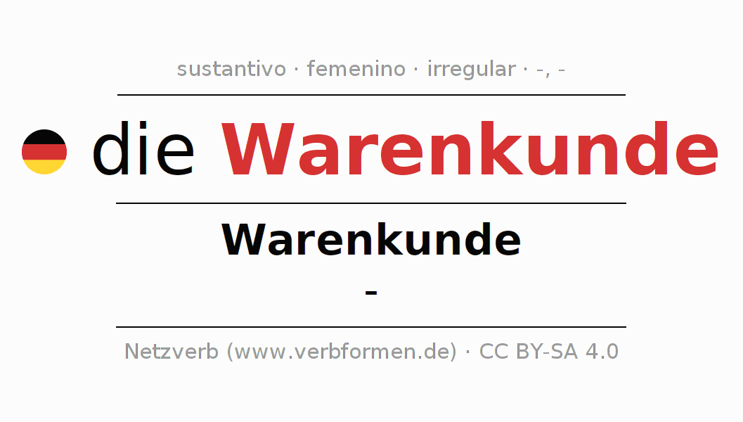 La declinación del sustantivoWarenkunde (estudio de mercancías, mercancías) se encuentra en genitivoWarenkunde del singular y en el nominativo- del plural. El sustantivo Warenkunde se declina con las terminaciones -/-. No permite construcciones en plural. El género gramatical de Warenkunde es femenino y por eso se requiere el artículo definido ‘die’. Aquí puedes declinar no solamente Warenkunde sino también todos los sustantivos alemanes . Comentarios ☆
