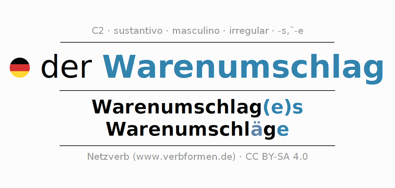 La declinación del sustantivo en forma de tabla con todas su formas: singular, plural y en los cuatro casos: nominativo (primer caso), genitivo (segundo caso), dativo (tercer caso) y acusativo (cuarto caso). Las construcciones gramaticales están representadas de forma clara en una tabla sinópica. La inflexión de los sustantivos es una ayuda durante tareas, exámenes, para cursos de alemán, la universidad, el estudio del alemán como lengua extranjera o como segundo idioma y para estudiantes adultos. La declinación correcta de las palabras es especialmente importante para los que aprenden el idioma alemán. Aquí encontraras más información acerca del tema Wiktionary Warenumschlag y aquí también a través del Duden Warenumschlag.