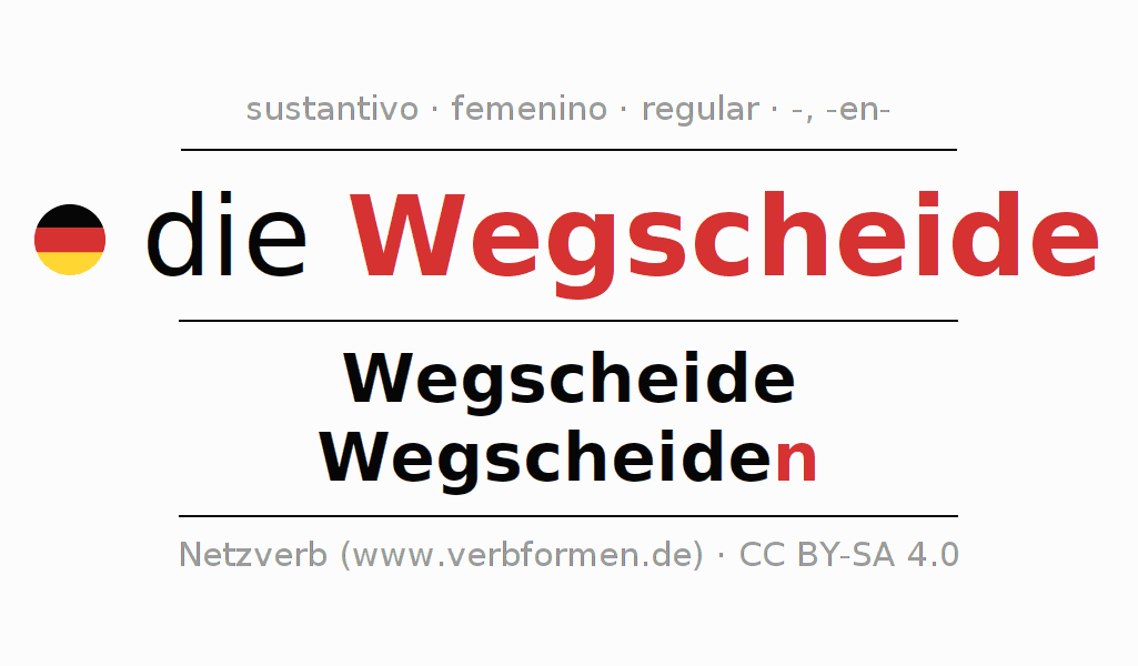 La declinación del sustantivoWegscheide se encuentra en genitivoWegscheide del singular y en el nominativoWegscheiden del plural. El sustantivo Wegscheide se declina de forma débil con las terminaciones -/n. El género gramatical de Wegscheide es femenino y por eso se requiere el artículo definido ‘die’. Aquí puedes declinar no solamente Wegscheide sino también todos los sustantivos alemanes . Comentarios ☆