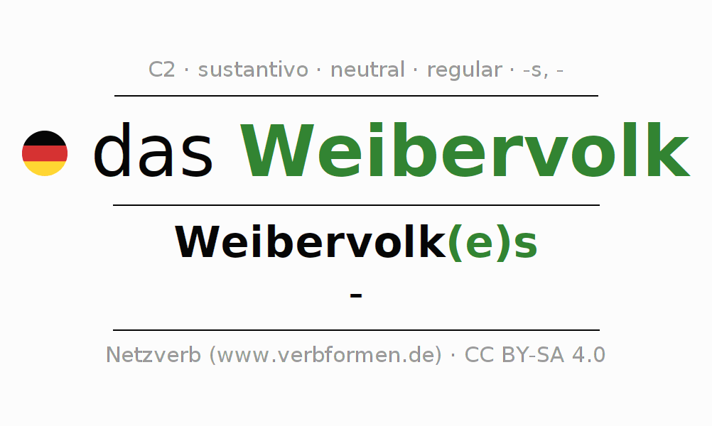 La declinación del sustantivo en forma de tabla con todas su formas: singular, plural y en los cuatro casos: nominativo (primer caso), genitivo (segundo caso), dativo (tercer caso) y acusativo (cuarto caso). Las construcciones gramaticales están representadas de forma clara en una tabla sinópica. La inflexión de los sustantivos es una ayuda durante tareas, exámenes, para cursos de alemán, la universidad, el estudio del alemán como lengua extranjera o como segundo idioma y para estudiantes adultos. La declinación correcta de las palabras es especialmente importante para los que aprenden el idioma alemán. Aquí encontraras más información acerca del tema Wiktionary Weibervolk y aquí también a través del Duden Weibervolk.