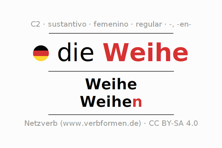 La declinación del sustantivo en forma de tabla con todas su formas: singular, plural y en los cuatro casos: nominativo (primer caso), genitivo (segundo caso), dativo (tercer caso) y acusativo (cuarto caso). Las construcciones gramaticales están representadas de forma clara en una tabla sinópica. La inflexión de los sustantivos es una ayuda durante tareas, exámenes, para cursos de alemán, la universidad, el estudio del alemán como lengua extranjera o como segundo idioma y para estudiantes adultos. La declinación correcta de las palabras es especialmente importante para los que aprenden el idioma alemán. Aquí encontraras más información acerca del tema Wiktionary Weihe y aquí también a través del Duden Weihe.