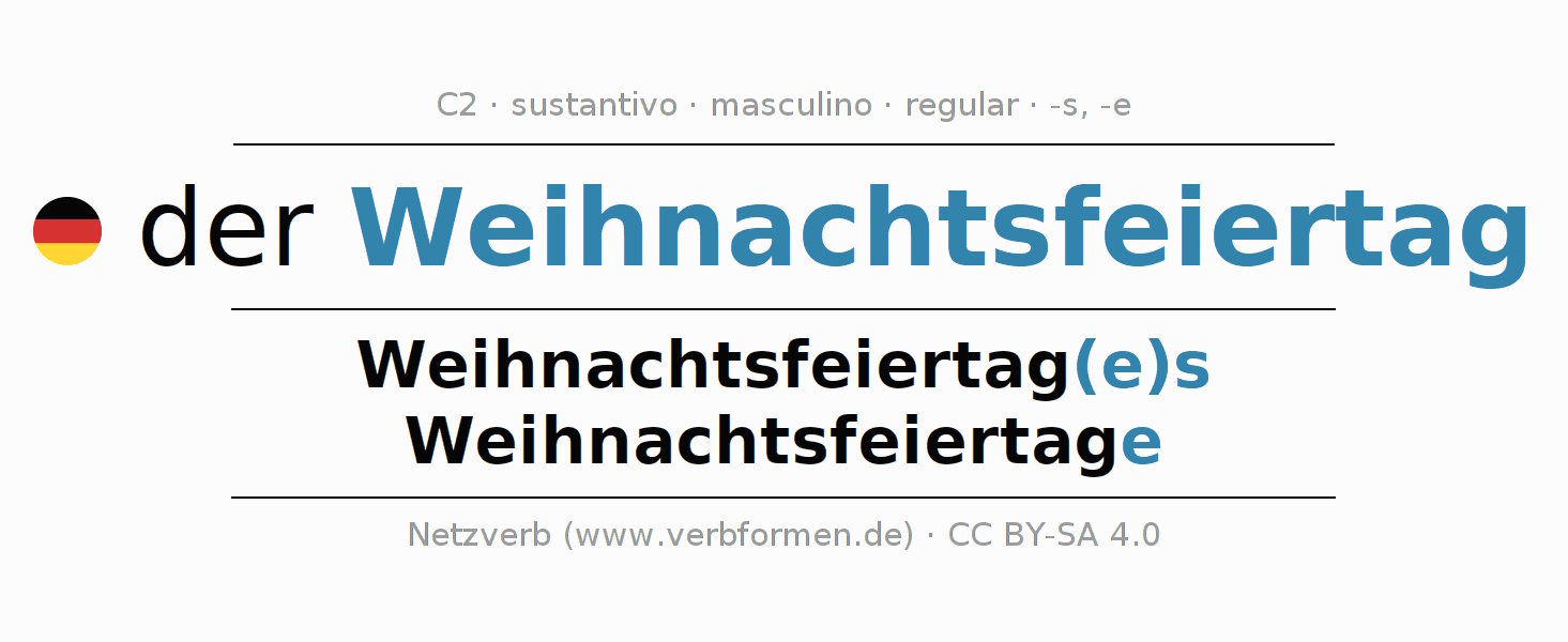 La declinación del sustantivo en forma de tabla con todas su formas: singular, plural y en los cuatro casos: nominativo (primer caso), genitivo (segundo caso), dativo (tercer caso) y acusativo (cuarto caso). Las construcciones gramaticales están representadas de forma clara en una tabla sinópica. La inflexión de los sustantivos es una ayuda durante tareas, exámenes, para cursos de alemán, la universidad, el estudio del alemán como lengua extranjera o como segundo idioma y para estudiantes adultos. La declinación correcta de las palabras es especialmente importante para los que aprenden el idioma alemán. Aquí encontraras más información acerca del tema Wiktionary Weihnachtsfeiertag y aquí también a través del Duden Weihnachtsfeiertag.