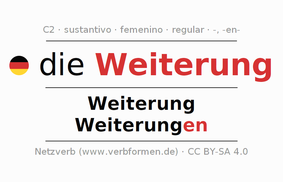 La declinación del sustantivo en forma de tabla con todas su formas: singular, plural y en los cuatro casos: nominativo (primer caso), genitivo (segundo caso), dativo (tercer caso) y acusativo (cuarto caso). Las construcciones gramaticales están representadas de forma clara en una tabla sinópica. La inflexión de los sustantivos es una ayuda durante tareas, exámenes, para cursos de alemán, la universidad, el estudio del alemán como lengua extranjera o como segundo idioma y para estudiantes adultos. La declinación correcta de las palabras es especialmente importante para los que aprenden el idioma alemán. Aquí encontraras más información acerca del tema Wiktionary Weiterung y aquí también a través del Duden Weiterung.