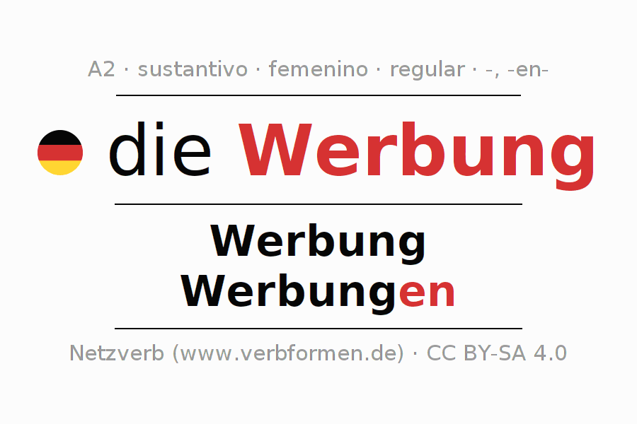 La declinación del sustantivoWerbung (publicidad, anuncio) se encuentra en genitivoWerbung del singular y en el nominativoWerbungen del plural. El sustantivo Werbung se declina de forma débil con las terminaciones -/en. El género gramatical de Werbung es femenino y por eso se requiere el artículo definido ‘die’. Aquí puedes declinar no solamente Werbung sino también todos los sustantivos alemanes . Este sustantivo pertenece al vocabulario necesario para pasar el examen "Zertifikat Deutsch" o para el nivel A2. Comentarios ☆