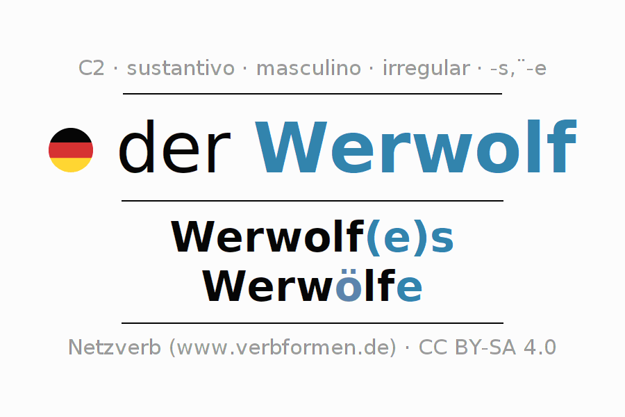 La declinación del sustantivo en forma de tabla con todas su formas: singular, plural y en los cuatro casos: nominativo (primer caso), genitivo (segundo caso), dativo (tercer caso) y acusativo (cuarto caso). Las construcciones gramaticales están representadas de forma clara en una tabla sinópica. La inflexión de los sustantivos es una ayuda durante tareas, exámenes, para cursos de alemán, la universidad, el estudio del alemán como lengua extranjera o como segundo idioma y para estudiantes adultos. La declinación correcta de las palabras es especialmente importante para los que aprenden el idioma alemán. Aquí encontraras más información acerca del tema Wiktionary Werwolf y aquí también a través del Duden Werwolf.