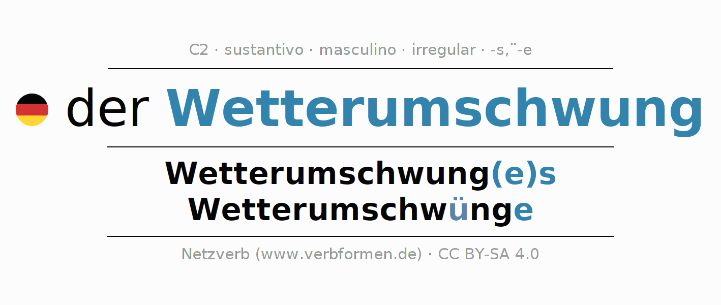 La declinación del sustantivo en forma de tabla con todas su formas: singular, plural y en los cuatro casos: nominativo (primer caso), genitivo (segundo caso), dativo (tercer caso) y acusativo (cuarto caso). Las construcciones gramaticales están representadas de forma clara en una tabla sinópica. La inflexión de los sustantivos es una ayuda durante tareas, exámenes, para cursos de alemán, la universidad, el estudio del alemán como lengua extranjera o como segundo idioma y para estudiantes adultos. La declinación correcta de las palabras es especialmente importante para los que aprenden el idioma alemán. Aquí encontraras más información acerca del tema Wiktionary Wetterumschwung y aquí también a través del Duden Wetterumschwung.