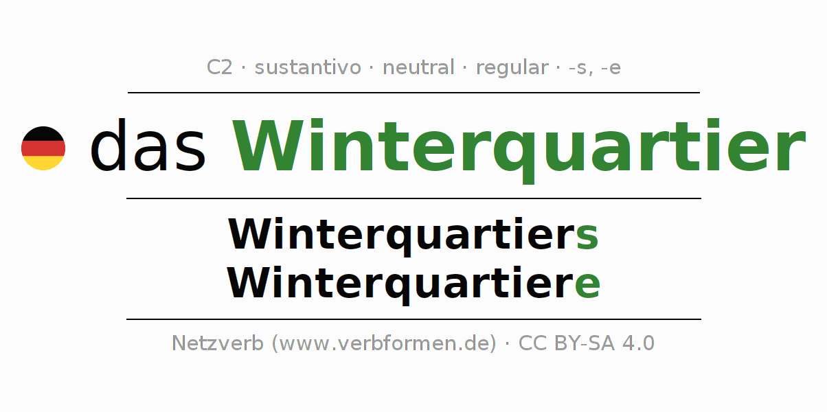 La declinación del sustantivo en forma de tabla con todas su formas: singular, plural y en los cuatro casos: nominativo (primer caso), genitivo (segundo caso), dativo (tercer caso) y acusativo (cuarto caso). Las construcciones gramaticales están representadas de forma clara en una tabla sinópica. La inflexión de los sustantivos es una ayuda durante tareas, exámenes, para cursos de alemán, la universidad, el estudio del alemán como lengua extranjera o como segundo idioma y para estudiantes adultos. La declinación correcta de las palabras es especialmente importante para los que aprenden el idioma alemán. Aquí encontraras más información acerca del tema Wiktionary Winterquartier y aquí también a través del Duden Winterquartier.