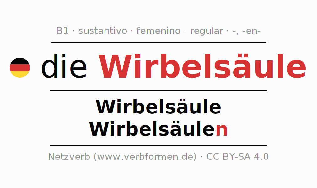 La declinación del sustantivo en forma de tabla con todas su formas: singular, plural y en los cuatro casos: nominativo (primer caso), genitivo (segundo caso), dativo (tercer caso) y acusativo (cuarto caso). Las construcciones gramaticales están representadas de forma clara en una tabla sinópica. La inflexión de los sustantivos es una ayuda durante tareas, exámenes, para cursos de alemán, la universidad, el estudio del alemán como lengua extranjera o como segundo idioma y para estudiantes adultos. La declinación correcta de las palabras es especialmente importante para los que aprenden el idioma alemán. Aquí encontraras más información acerca del tema Wiktionary Wirbelsäule y aquí también a través del Duden Wirbelsäule.