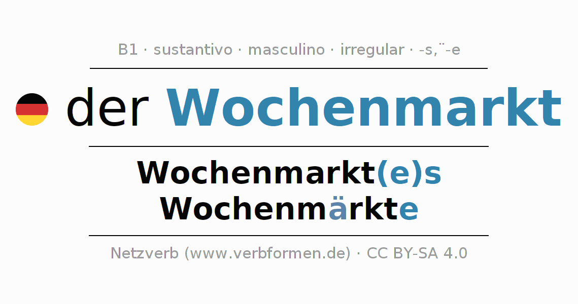 La declinación del sustantivo en forma de tabla con todas su formas: singular, plural y en los cuatro casos: nominativo (primer caso), genitivo (segundo caso), dativo (tercer caso) y acusativo (cuarto caso). Las construcciones gramaticales están representadas de forma clara en una tabla sinópica. La inflexión de los sustantivos es una ayuda durante tareas, exámenes, para cursos de alemán, la universidad, el estudio del alemán como lengua extranjera o como segundo idioma y para estudiantes adultos. La declinación correcta de las palabras es especialmente importante para los que aprenden el idioma alemán. Aquí encontraras más información acerca del tema Wiktionary Wochenmarkt y aquí también a través del Duden Wochenmarkt.