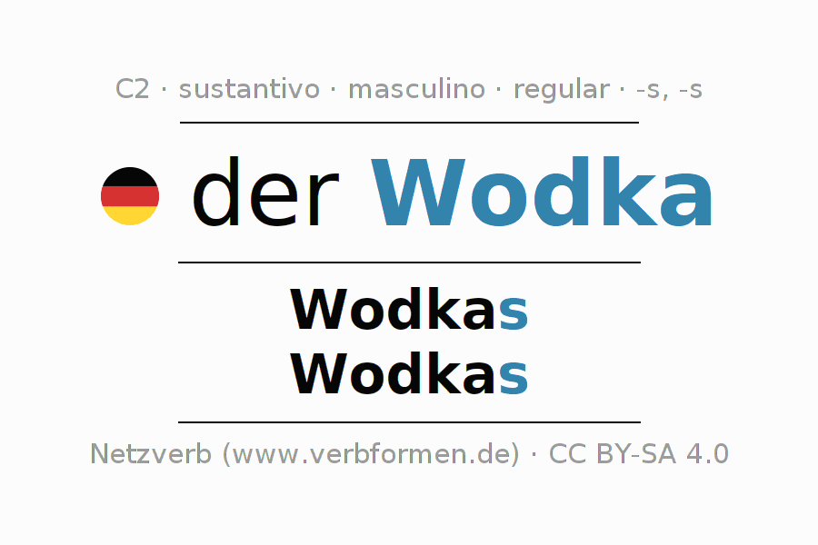 La declinación del sustantivoWodka (vodka) se encuentra en genitivoWodkas del singular y en el nominativoWodkas del plural. El sustantivo Wodka se conjuga de forma fuerte (irregular) con estas terminaciones s/s. El género gramatical de Wodka es masculino y por eso se requiere el artículo definido ‘der’. Aquí puedes declinar no solamente Wodka sino también todos los sustantivos alemanes . Este sustantivo pertenece al vocabulario necesario para pasar el examen "Zertifikat Deutsch" o para el nivel C2. Comentarios ☆