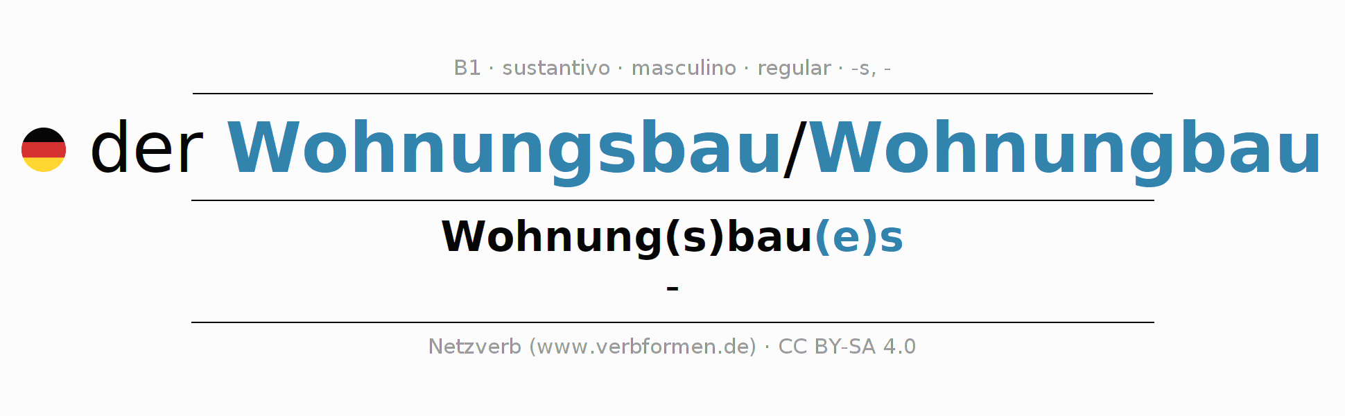La declinación del sustantivo en forma de tabla con todas su formas: singular, plural y en los cuatro casos: nominativo (primer caso), genitivo (segundo caso), dativo (tercer caso) y acusativo (cuarto caso). Las construcciones gramaticales están representadas de forma clara en una tabla sinópica. La inflexión de los sustantivos es una ayuda durante tareas, exámenes, para cursos de alemán, la universidad, el estudio del alemán como lengua extranjera o como segundo idioma y para estudiantes adultos. La declinación correcta de las palabras es especialmente importante para los que aprenden el idioma alemán. Aquí encontraras más información acerca del tema Wiktionary Wohnungsbau y aquí también a través del Duden Wohnungsbau.