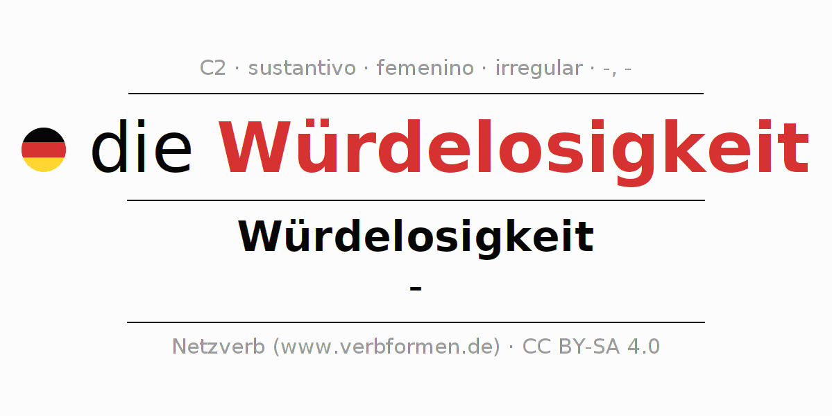 La declinación del sustantivo en forma de tabla con todas su formas: singular, plural y en los cuatro casos: nominativo (primer caso), genitivo (segundo caso), dativo (tercer caso) y acusativo (cuarto caso). Las construcciones gramaticales están representadas de forma clara en una tabla sinópica. La inflexión de los sustantivos es una ayuda durante tareas, exámenes, para cursos de alemán, la universidad, el estudio del alemán como lengua extranjera o como segundo idioma y para estudiantes adultos. La declinación correcta de las palabras es especialmente importante para los que aprenden el idioma alemán. Aquí encontraras más información acerca del tema Wiktionary Würdelosigkeit y aquí también a través del Duden Würdelosigkeit.