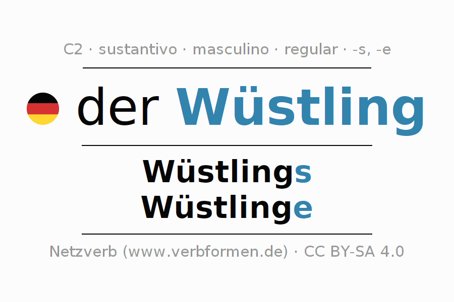 La declinación del sustantivo en forma de tabla con todas su formas: singular, plural y en los cuatro casos: nominativo (primer caso), genitivo (segundo caso), dativo (tercer caso) y acusativo (cuarto caso). Las construcciones gramaticales están representadas de forma clara en una tabla sinópica. La inflexión de los sustantivos es una ayuda durante tareas, exámenes, para cursos de alemán, la universidad, el estudio del alemán como lengua extranjera o como segundo idioma y para estudiantes adultos. La declinación correcta de las palabras es especialmente importante para los que aprenden el idioma alemán. Aquí encontraras más información acerca del tema Wiktionary Wüstling y aquí también a través del Duden Wüstling.