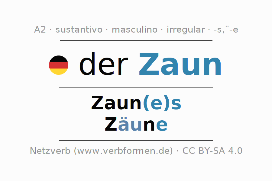 La declinación del sustantivo en forma de tabla con todas su formas: singular, plural y en los cuatro casos: nominativo (primer caso), genitivo (segundo caso), dativo (tercer caso) y acusativo (cuarto caso). Las construcciones gramaticales están representadas de forma clara en una tabla sinópica. La inflexión de los sustantivos es una ayuda durante tareas, exámenes, para cursos de alemán, la universidad, el estudio del alemán como lengua extranjera o como segundo idioma y para estudiantes adultos. La declinación correcta de las palabras es especialmente importante para los que aprenden el idioma alemán. Aquí encontraras más información acerca del tema Wiktionary Zaun y aquí también a través del Duden Zaun.