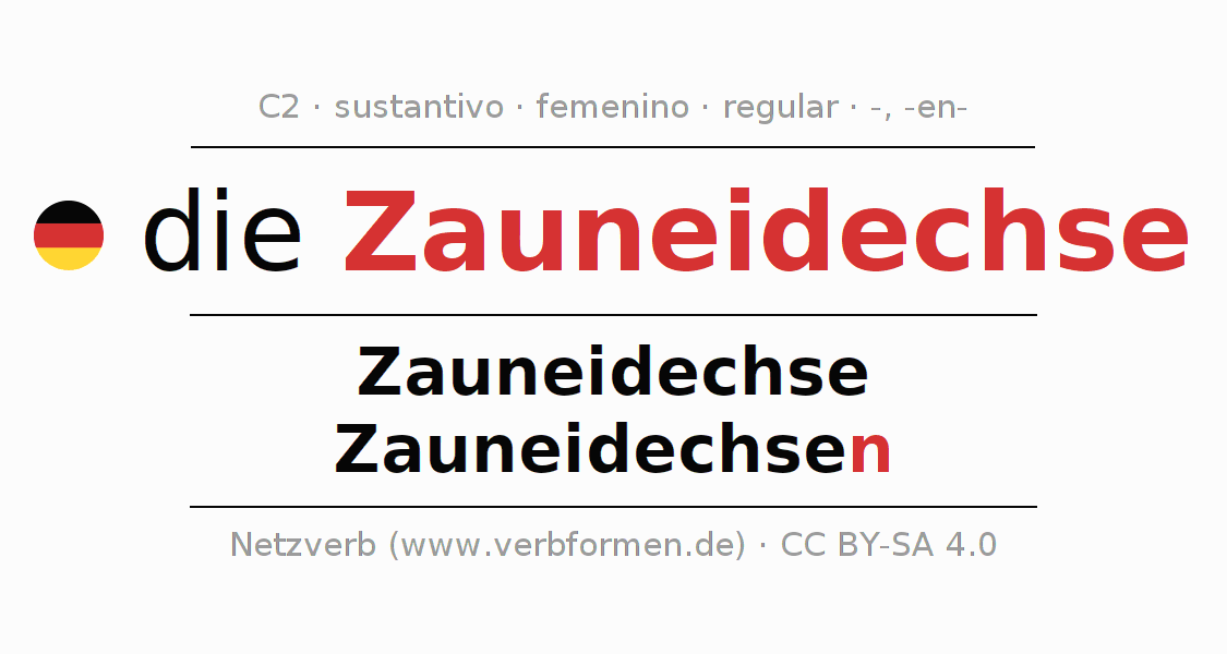 La declinación del sustantivo en forma de tabla con todas su formas: singular, plural y en los cuatro casos: nominativo (primer caso), genitivo (segundo caso), dativo (tercer caso) y acusativo (cuarto caso). Las construcciones gramaticales están representadas de forma clara en una tabla sinópica. La inflexión de los sustantivos es una ayuda durante tareas, exámenes, para cursos de alemán, la universidad, el estudio del alemán como lengua extranjera o como segundo idioma y para estudiantes adultos. La declinación correcta de las palabras es especialmente importante para los que aprenden el idioma alemán. Aquí encontraras más información acerca del tema Wiktionary Zauneidechse y aquí también a través del Duden Zauneidechse.