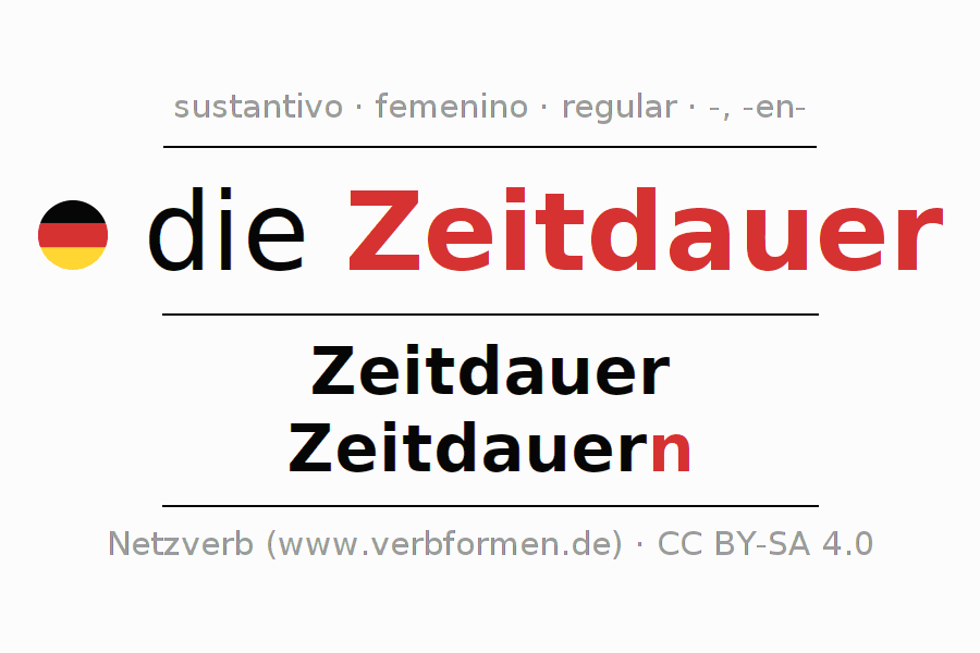 La declinación del sustantivo en forma de tabla con todas su formas: singular, plural y en los cuatro casos: nominativo (primer caso), genitivo (segundo caso), dativo (tercer caso) y acusativo (cuarto caso). Las construcciones gramaticales están representadas de forma clara en una tabla sinópica. La inflexión de los sustantivos es una ayuda durante tareas, exámenes, para cursos de alemán, la universidad, el estudio del alemán como lengua extranjera o como segundo idioma y para estudiantes adultos. La declinación correcta de las palabras es especialmente importante para los que aprenden el idioma alemán. Aquí encontraras más información acerca del tema Wiktionary Zeitdauer y aquí también a través del Duden Zeitdauer.