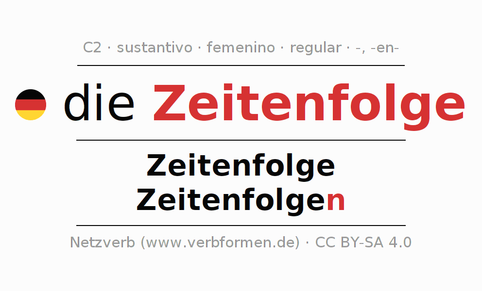 La declinación del sustantivoZeitenfolge (consecutio temporum, correlación de tiempos) se encuentra en genitivoZeitenfolge del singular y en el nominativoZeitenfolgen del plural. El sustantivo Zeitenfolge se declina de forma débil con las terminaciones -/n. El género gramatical de Zeitenfolge es femenino y por eso se requiere el artículo definido ‘die’. Aquí puedes declinar no solamente Zeitenfolge sino también todos los sustantivos alemanes . Este sustantivo pertenece al vocabulario necesario para pasar el examen "Zertifikat Deutsch" o para el nivel C2. Comentarios ☆