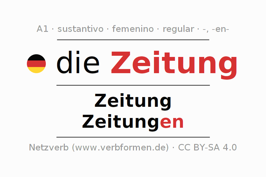 La declinación del sustantivoZeitung (diario, periódico) se encuentra en genitivoZeitung del singular y en el nominativoZeitungen del plural. El sustantivo Zeitung se declina de forma débil con las terminaciones -/en. El género gramatical de Zeitung es femenino y por eso se requiere el artículo definido ‘die’. Aquí puedes declinar no solamente Zeitung sino también todos los sustantivos alemanes . Este sustantivo pertenece al vocabulario necesario para pasar el examen "Zertifikat Deutsch" o para el nivel A1. Comentarios ☆