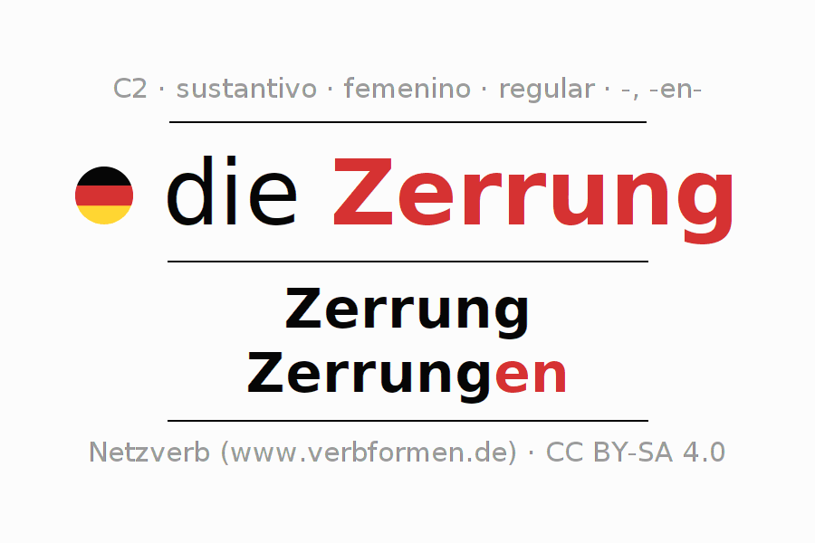 La declinación del sustantivo en forma de tabla con todas su formas: singular, plural y en los cuatro casos: nominativo (primer caso), genitivo (segundo caso), dativo (tercer caso) y acusativo (cuarto caso). Las construcciones gramaticales están representadas de forma clara en una tabla sinópica. La inflexión de los sustantivos es una ayuda durante tareas, exámenes, para cursos de alemán, la universidad, el estudio del alemán como lengua extranjera o como segundo idioma y para estudiantes adultos. La declinación correcta de las palabras es especialmente importante para los que aprenden el idioma alemán. Aquí encontraras más información acerca del tema Wiktionary Zerrung y aquí también a través del Duden Zerrung.