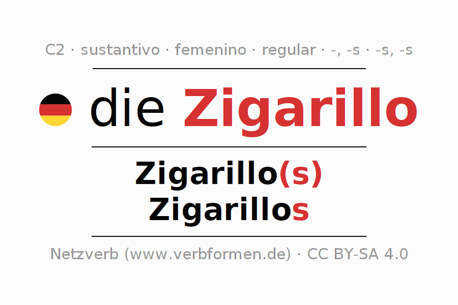 La declinación del sustantivo en forma de tabla con todas su formas: singular, plural y en los cuatro casos: nominativo (primer caso), genitivo (segundo caso), dativo (tercer caso) y acusativo (cuarto caso). Las construcciones gramaticales están representadas de forma clara en una tabla sinópica. La inflexión de los sustantivos es una ayuda durante tareas, exámenes, para cursos de alemán, la universidad, el estudio del alemán como lengua extranjera o como segundo idioma y para estudiantes adultos. La declinación correcta de las palabras es especialmente importante para los que aprenden el idioma alemán. Aquí encontraras más información acerca del tema Wiktionary die Zigarillo y aquí también a través del Duden die Zigarillo.