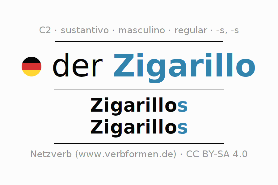 La declinación del sustantivo en forma de tabla con todas su formas: singular, plural y en los cuatro casos: nominativo (primer caso), genitivo (segundo caso), dativo (tercer caso) y acusativo (cuarto caso). Las construcciones gramaticales están representadas de forma clara en una tabla sinópica. La inflexión de los sustantivos es una ayuda durante tareas, exámenes, para cursos de alemán, la universidad, el estudio del alemán como lengua extranjera o como segundo idioma y para estudiantes adultos. La declinación correcta de las palabras es especialmente importante para los que aprenden el idioma alemán. Aquí encontraras más información acerca del tema Wiktionary der Zigarillo y aquí también a través del Duden der Zigarillo.