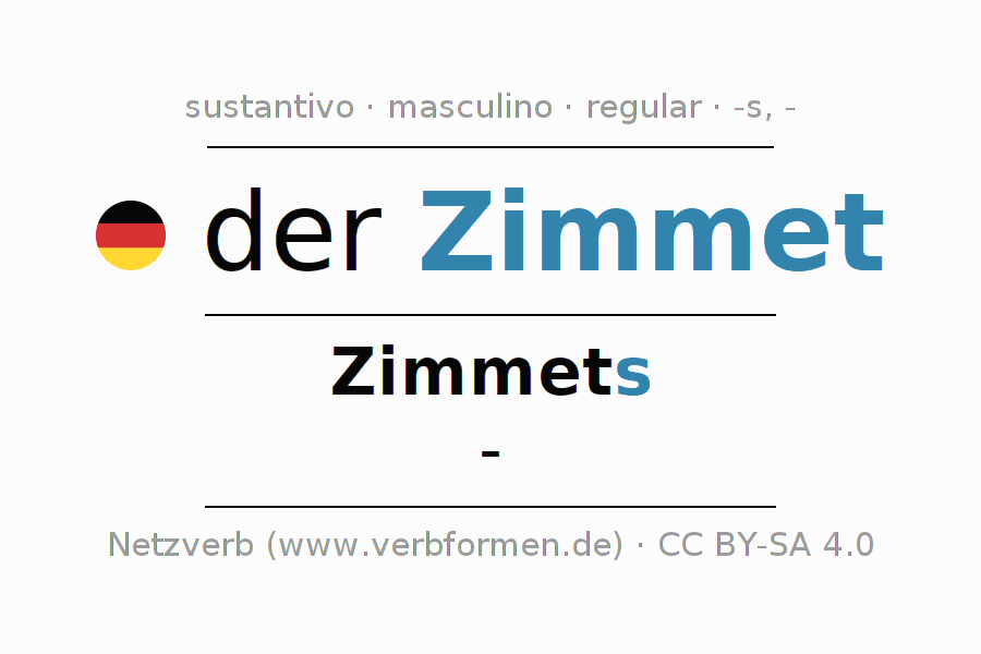 La declinación del sustantivoZimmet se encuentra en genitivoZimmets del singular y en el nominativo- del plural. El sustantivo Zimmet se conjuga de forma fuerte (irregular) con estas terminaciones s/-. No permite construcciones en plural. El género gramatical de Zimmet es masculino y por eso se requiere el artículo definido ‘der’. Aquí puedes declinar no solamente Zimmet sino también todos los sustantivos alemanes . Comentarios ☆