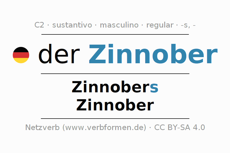 La declinación del sustantivo en forma de tabla con todas su formas: singular, plural y en los cuatro casos: nominativo (primer caso), genitivo (segundo caso), dativo (tercer caso) y acusativo (cuarto caso). Las construcciones gramaticales están representadas de forma clara en una tabla sinópica. La inflexión de los sustantivos es una ayuda durante tareas, exámenes, para cursos de alemán, la universidad, el estudio del alemán como lengua extranjera o como segundo idioma y para estudiantes adultos. La declinación correcta de las palabras es especialmente importante para los que aprenden el idioma alemán. Aquí encontraras más información acerca del tema Wiktionary Zinnober y aquí también a través del Duden Zinnober.