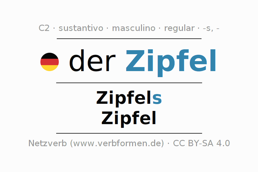 La declinación del sustantivoZipfel (extremo, punta) se encuentra en genitivoZipfels del singular y en el nominativoZipfel del plural. El sustantivo Zipfel se conjuga de forma fuerte (irregular) con estas terminaciones s/-. El género gramatical de Zipfel es masculino y por eso se requiere el artículo definido ‘der’. Aquí puedes declinar no solamente Zipfel sino también todos los sustantivos alemanes . Este sustantivo pertenece al vocabulario necesario para pasar el examen "Zertifikat Deutsch" o para el nivel C2. Comentarios ☆
