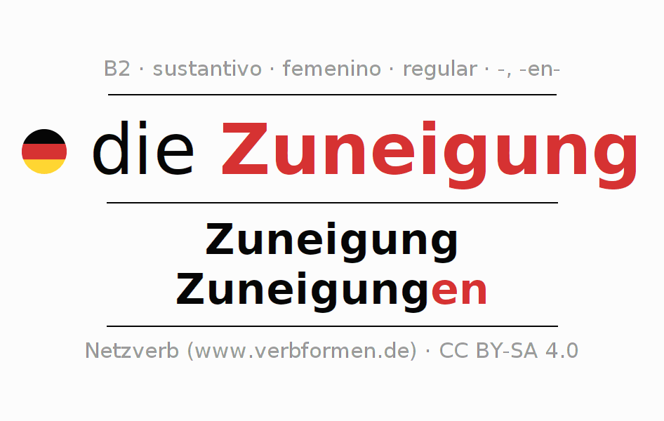 La declinación del sustantivoZuneigung (afecto, cariño) se encuentra en genitivoZuneigung del singular y en el nominativoZuneigungen del plural. El sustantivo Zuneigung se declina de forma débil con las terminaciones -/en. El género gramatical de Zuneigung es femenino y por eso se requiere el artículo definido ‘die’. Aquí puedes declinar no solamente Zuneigung sino también todos los sustantivos alemanes . Este sustantivo pertenece al vocabulario necesario para pasar el examen "Zertifikat Deutsch" o para el nivel B2. Comentarios ☆