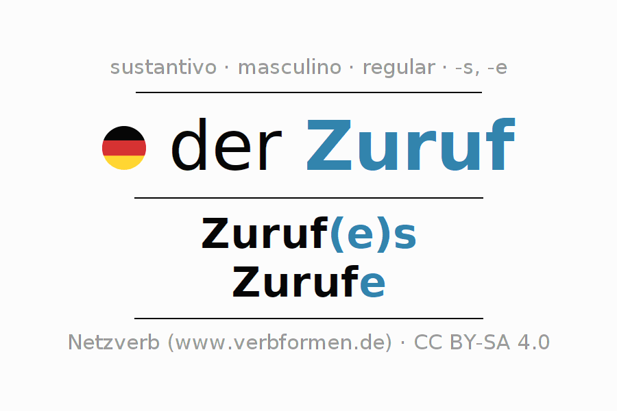 La declinación del sustantivo en forma de tabla con todas su formas: singular, plural y en los cuatro casos: nominativo (primer caso), genitivo (segundo caso), dativo (tercer caso) y acusativo (cuarto caso). Las construcciones gramaticales están representadas de forma clara en una tabla sinópica. La inflexión de los sustantivos es una ayuda durante tareas, exámenes, para cursos de alemán, la universidad, el estudio del alemán como lengua extranjera o como segundo idioma y para estudiantes adultos. La declinación correcta de las palabras es especialmente importante para los que aprenden el idioma alemán. Aquí encontraras más información acerca del tema Wiktionary Zuruf y aquí también a través del Duden Zuruf.